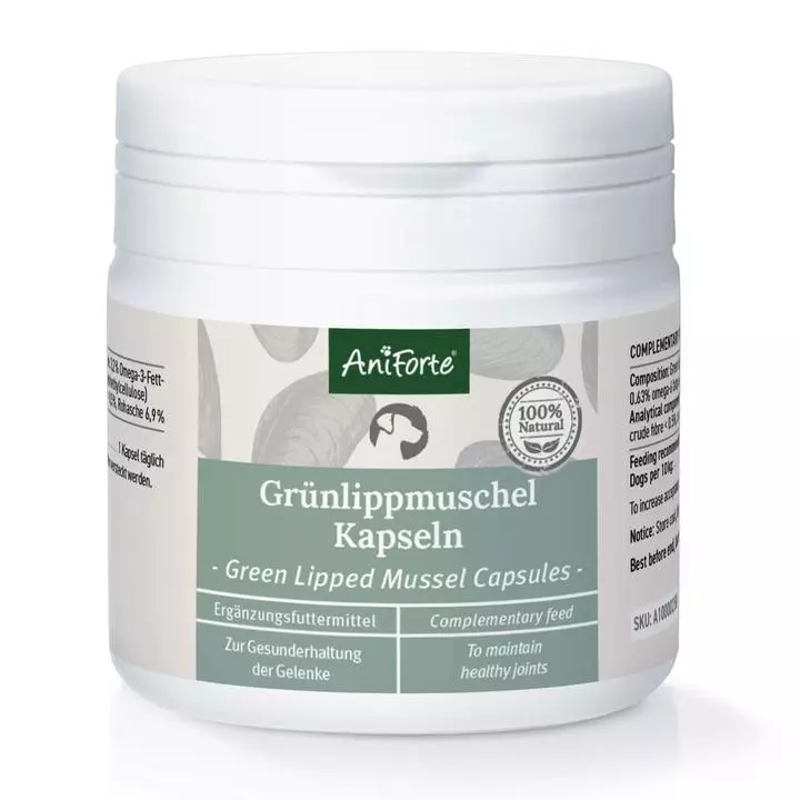 - Green lipped mussel powder (3.3% glycosaminoglycans, 3.2% omega-3 fatty acids, 0.63% omega-6 fatty acids), vegan capsule shell (hydroxypropylmethylcellulose)