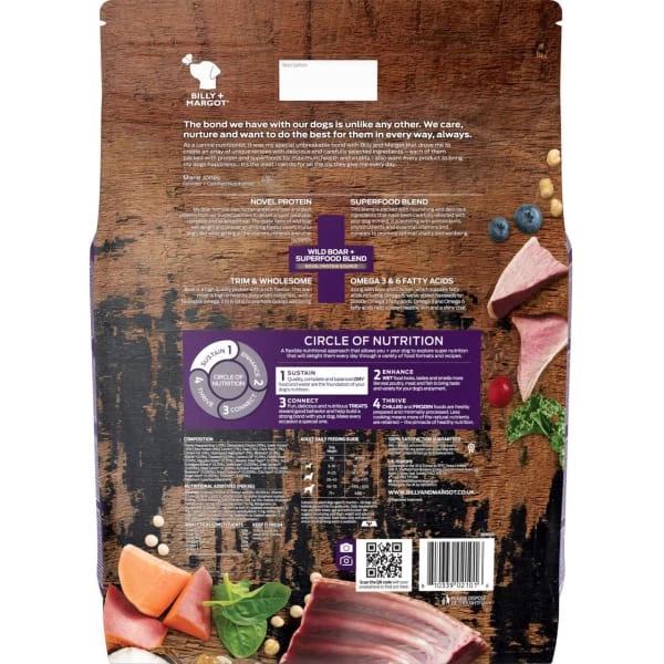Billy + Margot Dry Dog food is high in single animal protein and has a unique blend of superfoods to keep your dog happy and healthy. Packed with nutritious ingredients and delicious flavours, our grain-free dry dog food can be the foundation of your dog’s nutrition and, together with water, is all your dog requires for a complete diet. Each ingredient in our dry dog food is specifically chosen for its uniqueness, dynamism and efficacy. A natural canine diet is based on a variety of different meats, which satisfies and nourishes dogs in a way that nothing else can. For this reason, raw or fresh meat is the number one ingredient in all our dry dog food. Within our range you’ll find a variety of delicious animal proteins, including salmon, lamb, chicken, wild kangaroo, wild boar, wild venison and duck, as well as several superfoods and fruit and vegetables, including Manuka honey, coconut oil, tumeric, ginger root, kale, spinach, carrots, pumpkin and blueberries. Suitable for adult dogs aged 15 months+. All dogs are individuals and this is a guide only. Daily requirements may vary with breed, age and activity level. We suggest monitoring your dog’s weight and adjusting amounts as required.