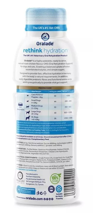 Oralade GI Support is a ready to use, highly palatable isotonic formula for cats and dogs, containing essential electrolytes, amino acids, carbohydrates and prebiotics in purified water.