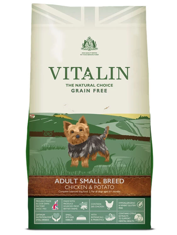 Vitalin Small Breed food has been carefully formulated as a nutritionally complete and balanced recipe for small breeds to provide all the nutrients required for a happy and healthy life. This hypoallergenic and grain free food contains high quality protein from 100% British Chicken with potatoes and nutrient packed botanicals.