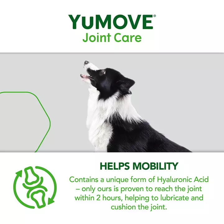 Hyaluronic Acid Helps to lubricate and cushion the joint. YuMOVE is the only joint supplement range with Hyaluronic Acid proven to reach the joint within 2 hours. It helps support the synovial fluid, which lubricates your dog’s joints.