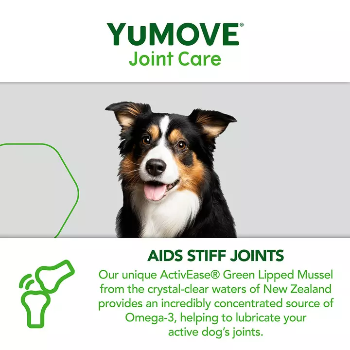 YuMOVE is formulated with ActivEase® Green Lipped Mussel containing 4x more active Omega 3 than standard competitor versions. It is an easy to give, tasty tablet that you feed daily. YuMOVE is the UK’s #1 veterinary joint supplement brand* helping over 1 million pets globally. Clinically proven to work in 6 weeks**